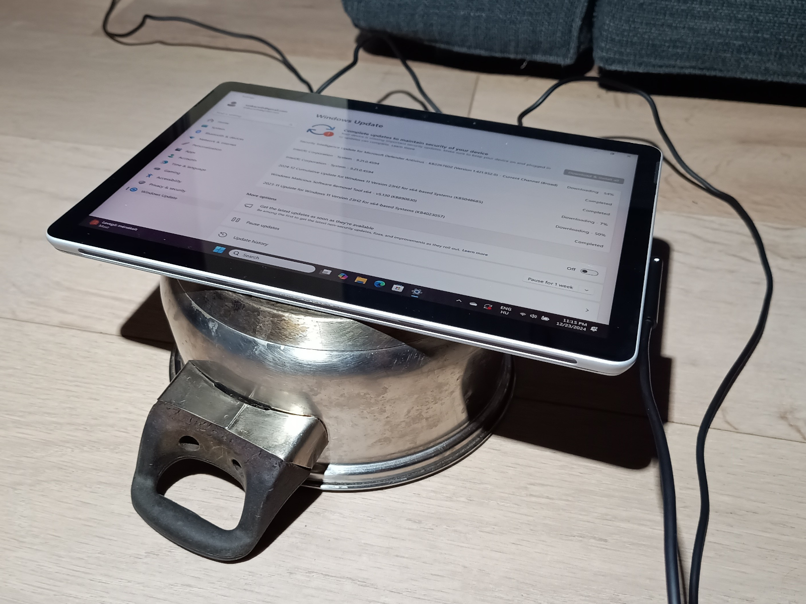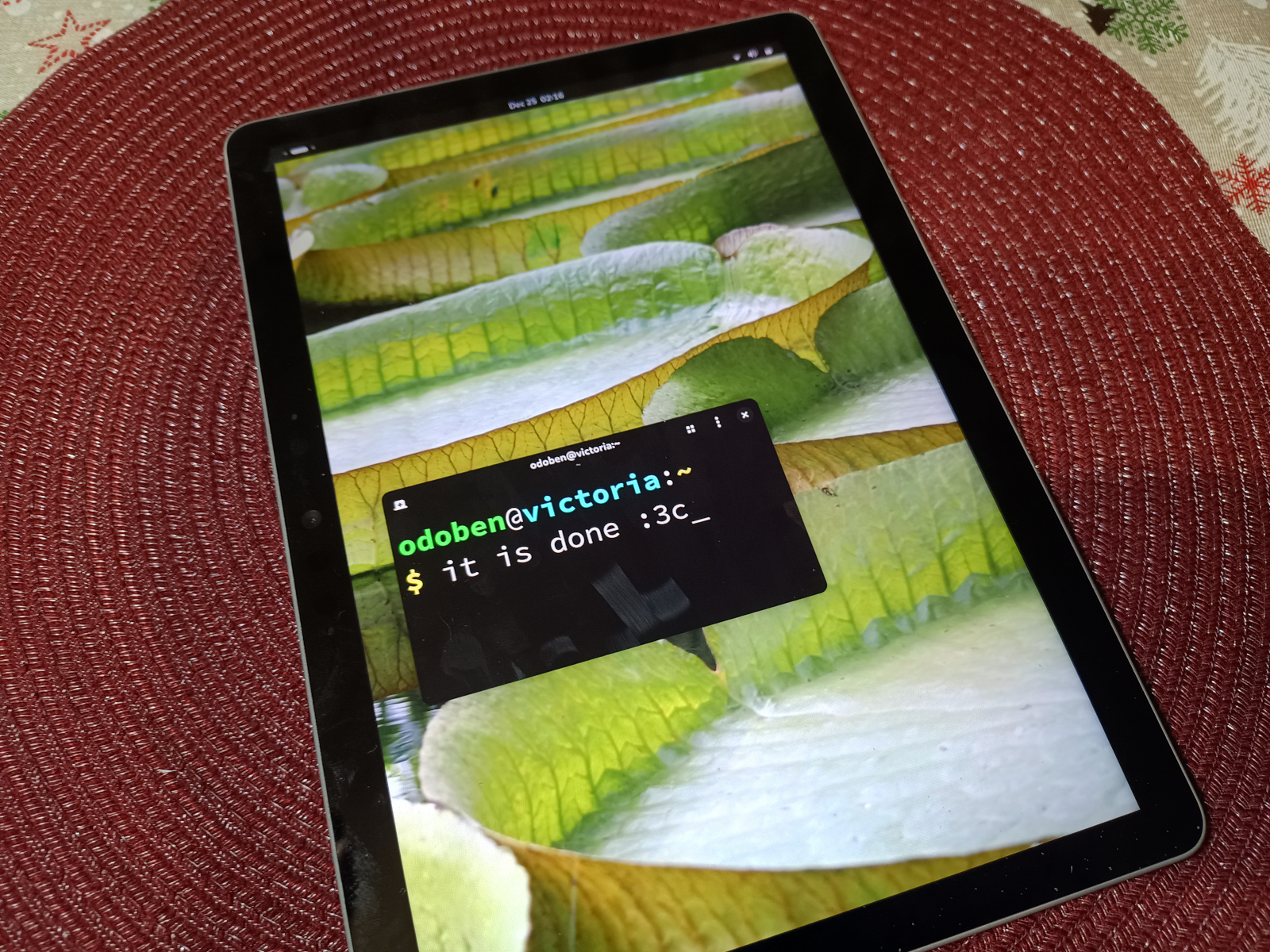First photo: advanced passive cooling mechanism at work. Second photo: the pains of installing an OS on a Surface without a TypeCover. Third Photo: Linux! Fourth photo: its namesake water lily.